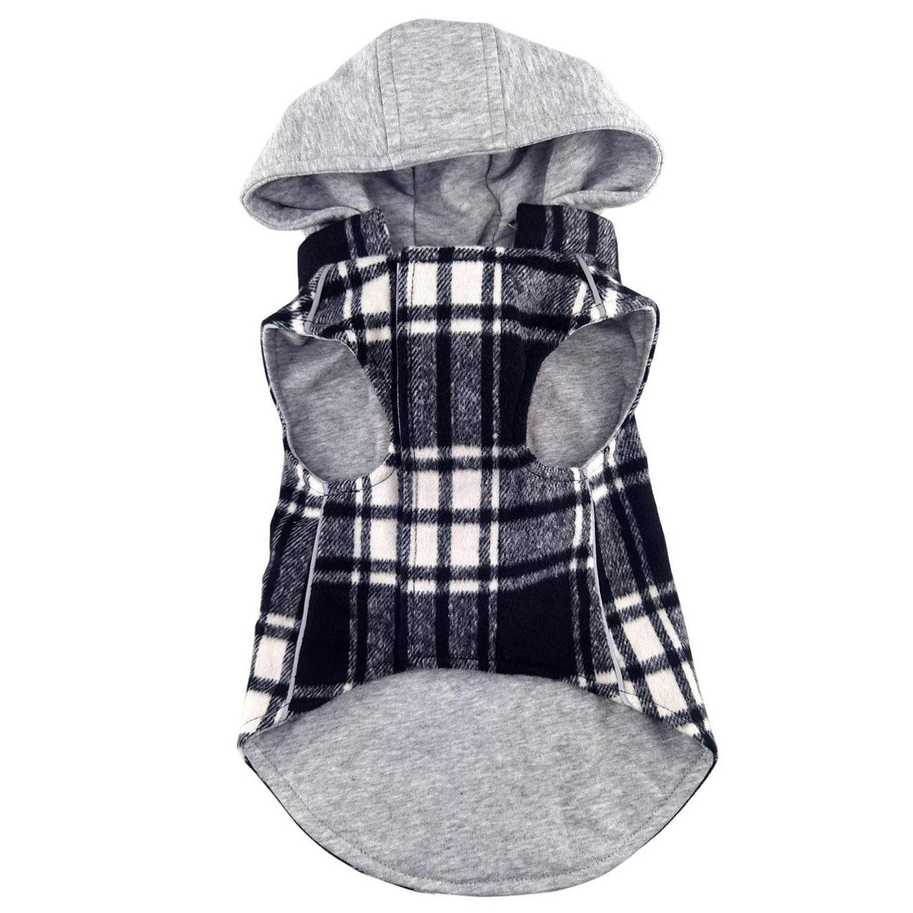 Our quilted Weekender Sweatshirt Hoodies are great for pups on the go! The outer shell is a quilted puffer style while the inner lining is cozy, jersey material. The hood is also made of jersey material and can easily zip off when not needed. Reflective stripping makes your pup noticeable in low light while the two-inch fastener down the chest provides an adjustable closure. Zippered pockets on the back provide a cute finishing detail, as well as an easy place to stash a few treats or a waste bag.