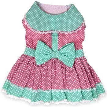 Polka Dot and Lace Dog Dress Set with Leash - Pink and Teal Polka Dot and Lace Dog Dress Set with Leash - Pink and Teal