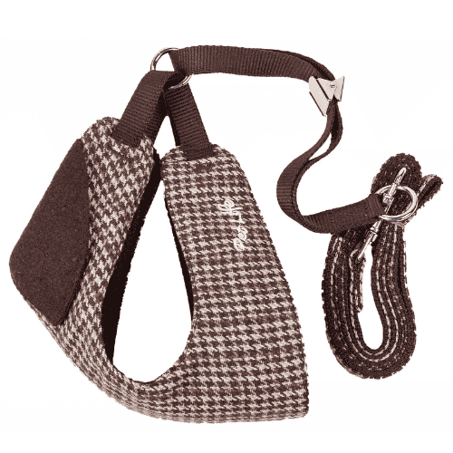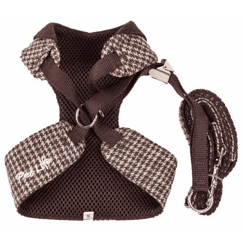 The Pet Life LUXE 'Houndsome' 2-in-1 Mesh Reversible Plaided Collared Adjustable Dog Harness-Leash features a brushed wool-like exterior and reversed with breathable accented Micro-mesh on both the coordinated Harness and Leash handle for premium comfort. The Harness features a well-coordinated dark brown collar that that sits above a dapper cocoa, beige and autumn brown houndstooth pattern. The back of the harness is completely adjustable with dual stainless steel hooks that connect to the swivel hook on the leash for multi-directional pull. The Pawsh harness was specially engineered to limit stress around the stomach by placing light stress around the sternum for proper comfort. Features reinforced stitching for durability. Available in Multiple Sizes.