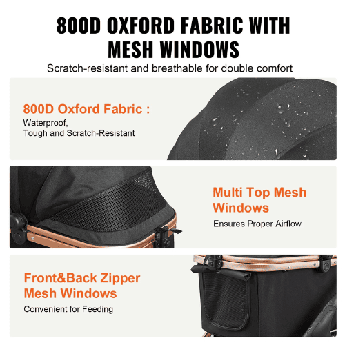 • 800D Oxford Fabric and Mesh Windows: The sturdy 800D Oxford fabric can withstand pet nibbling, keeping the cat stroller in pristine condition. Multiple breathable mesh windows ensure unhindered airflow, providing your pet with a wide field of vision. The button design allows for effortless unfolding.